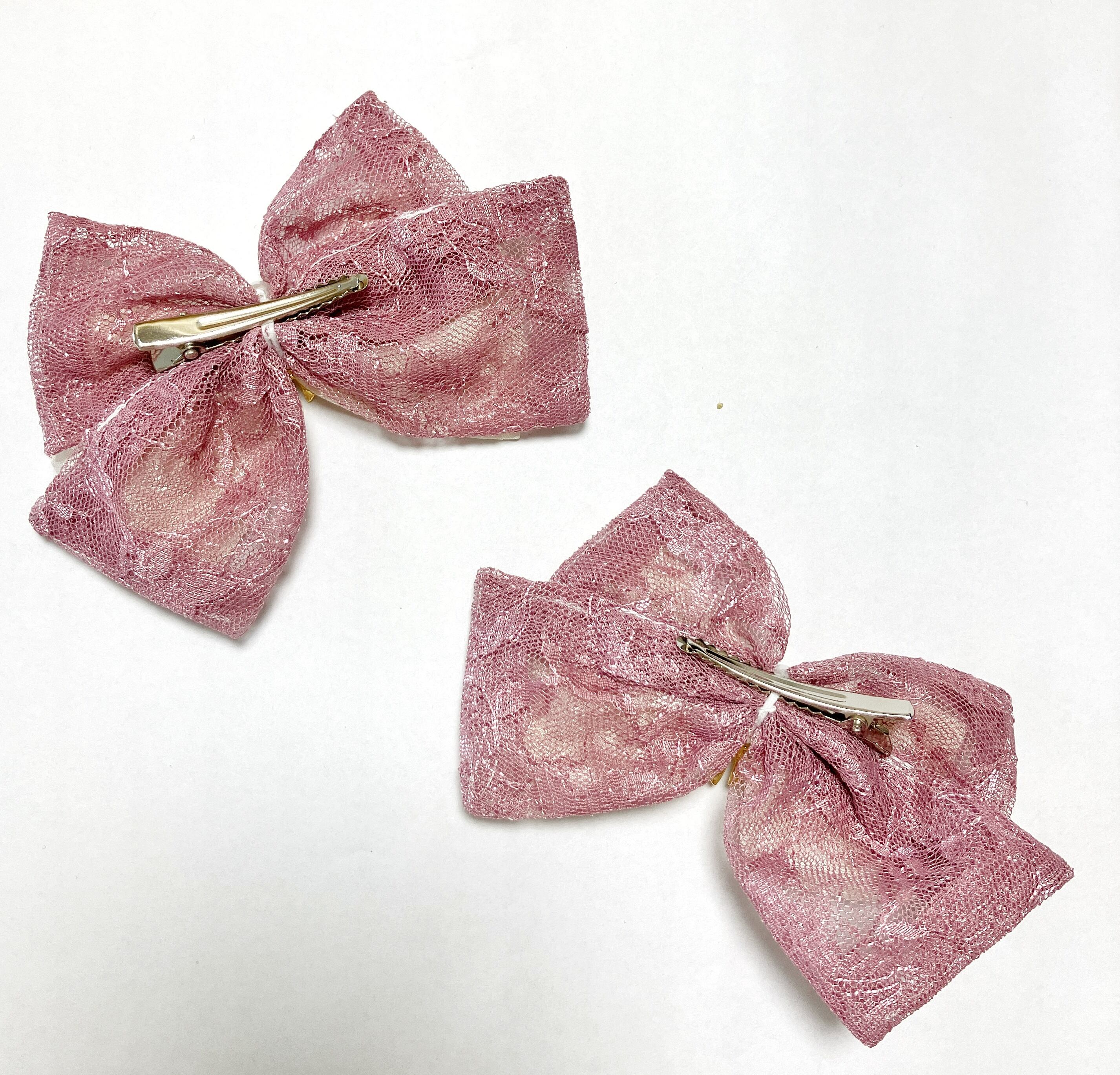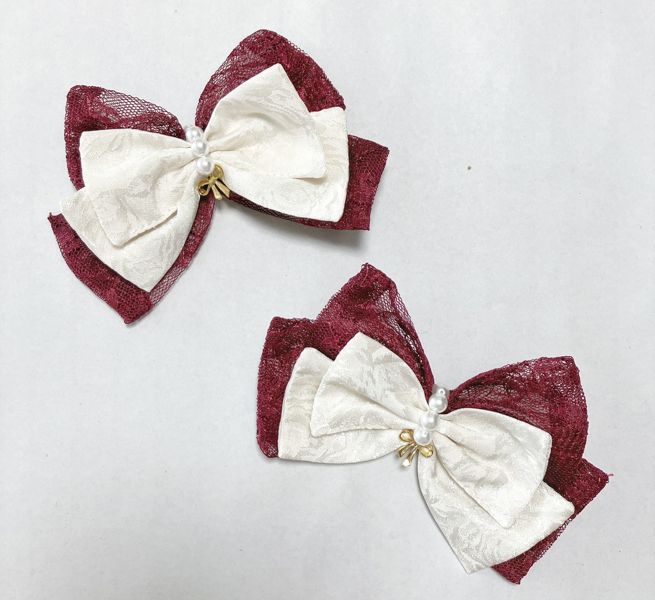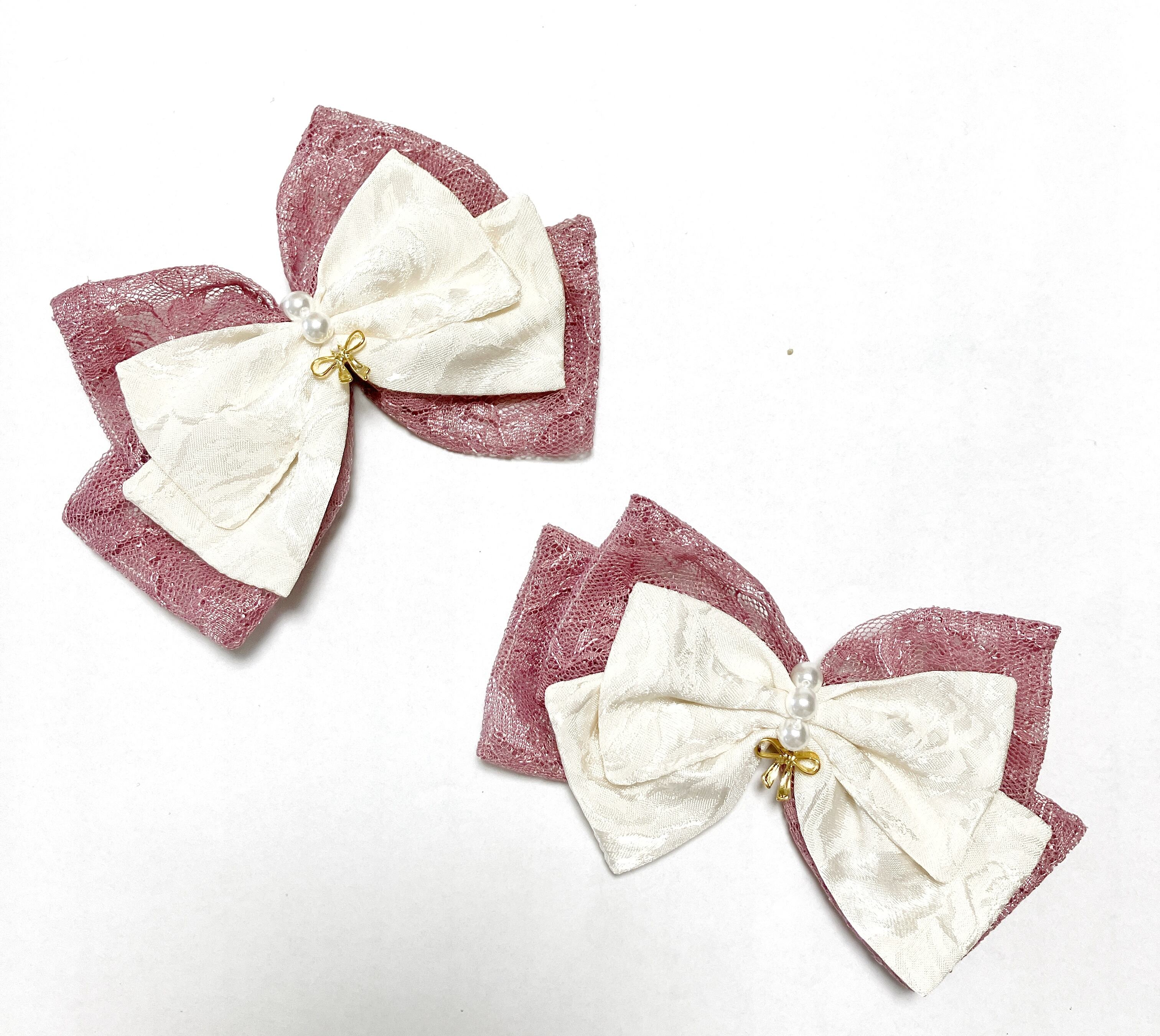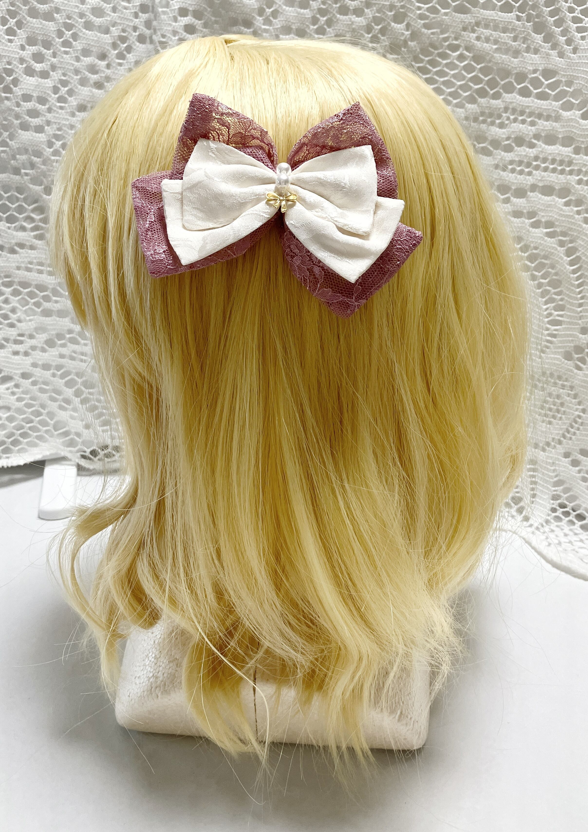 生成の薔薇柄のジャガード生地とシックな色味のレースを用いた、金色のリボン型チャームがアクセントのリボンクリップです。