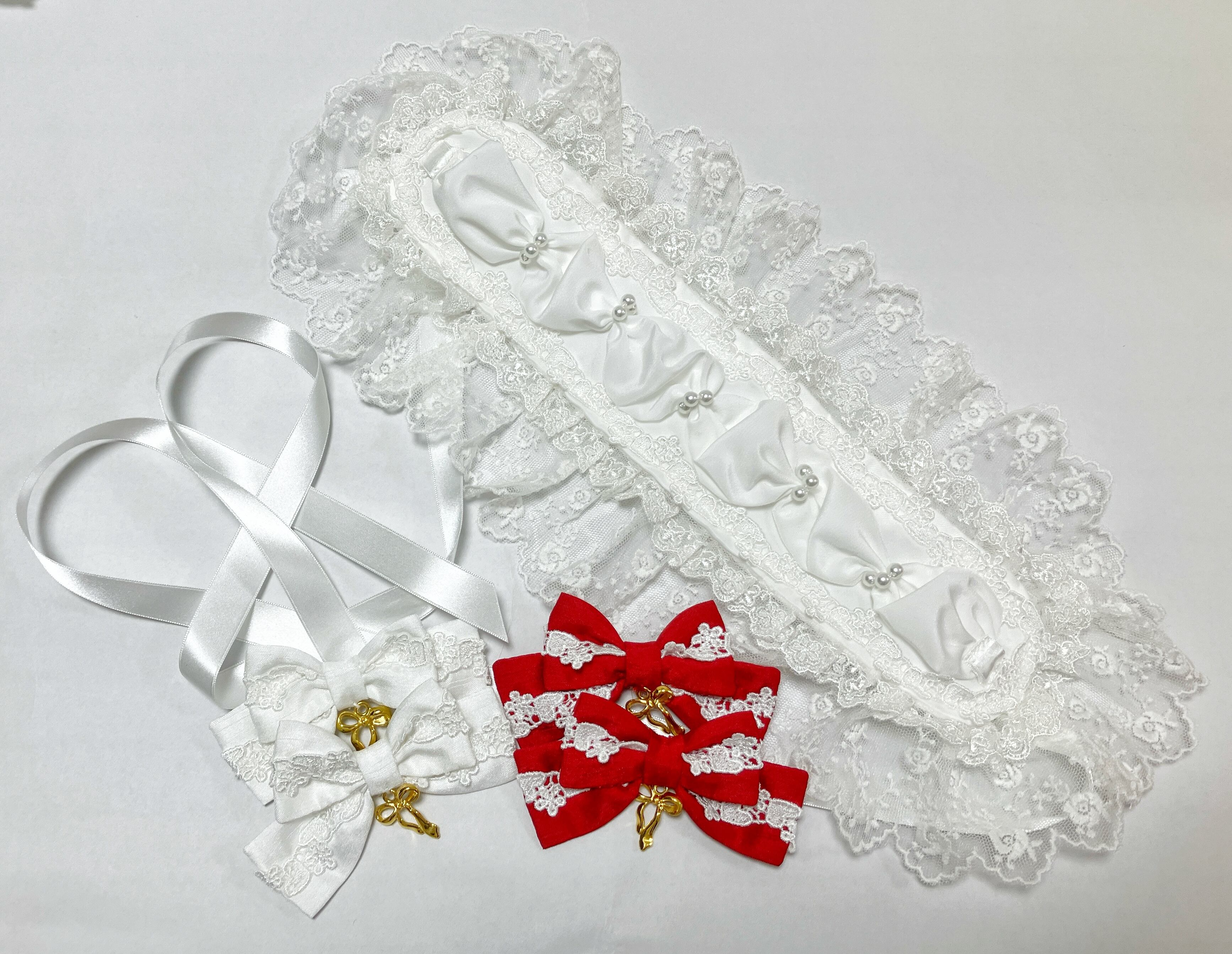 チュールレース、サテンリボン、ケミカルレース、ポリエステルシャンタン、ポリエステルデシン、樹脂製パール、ステンレス