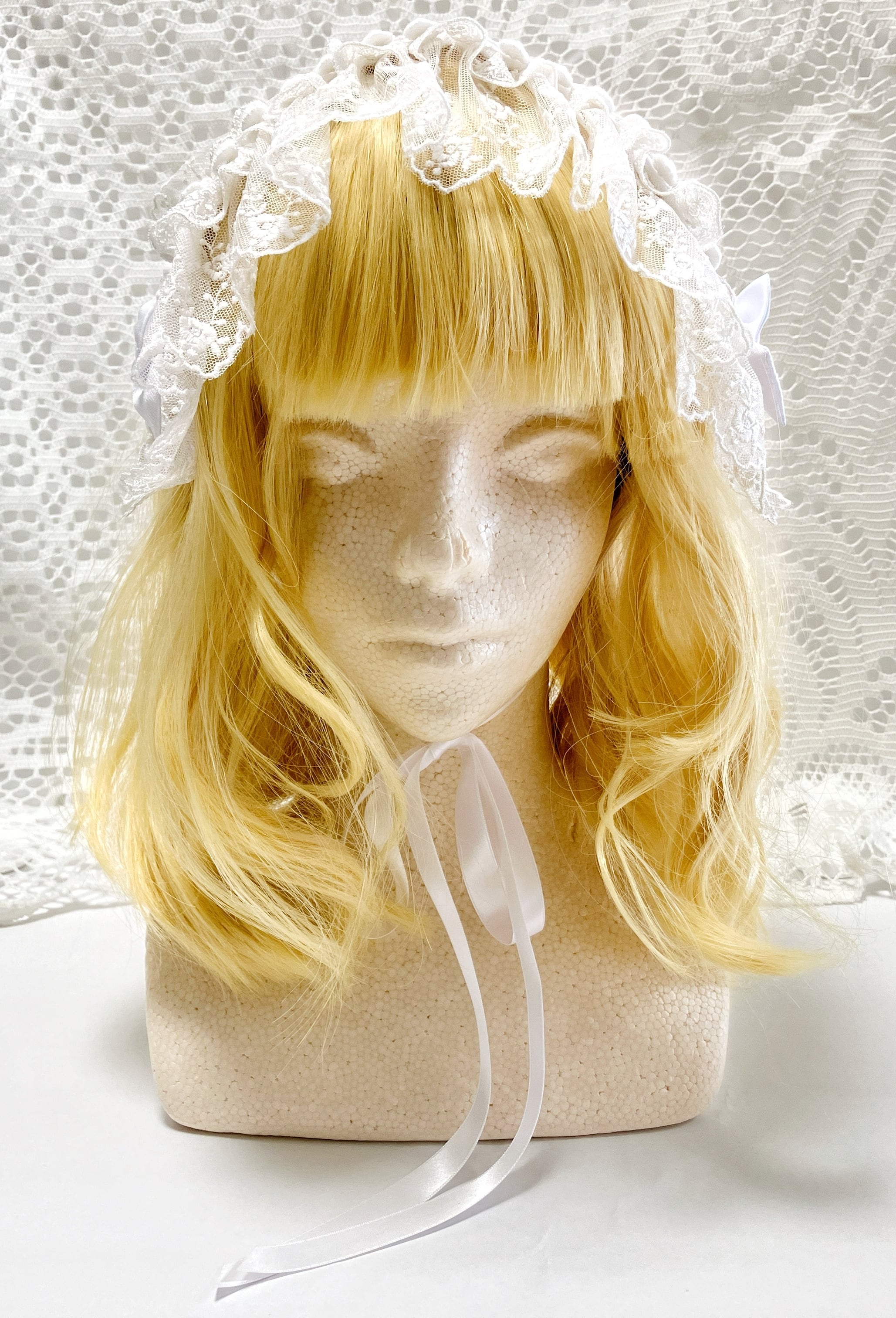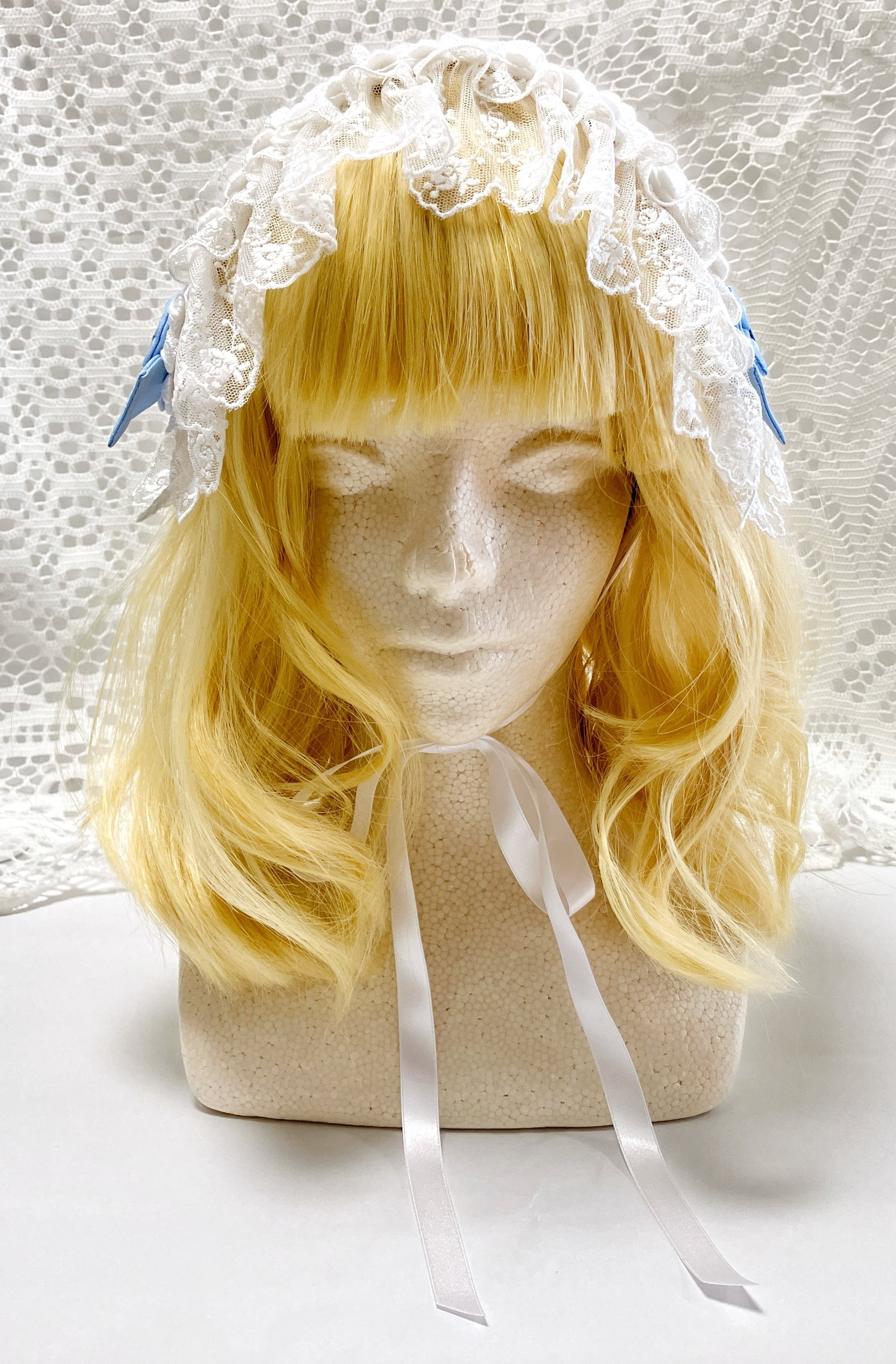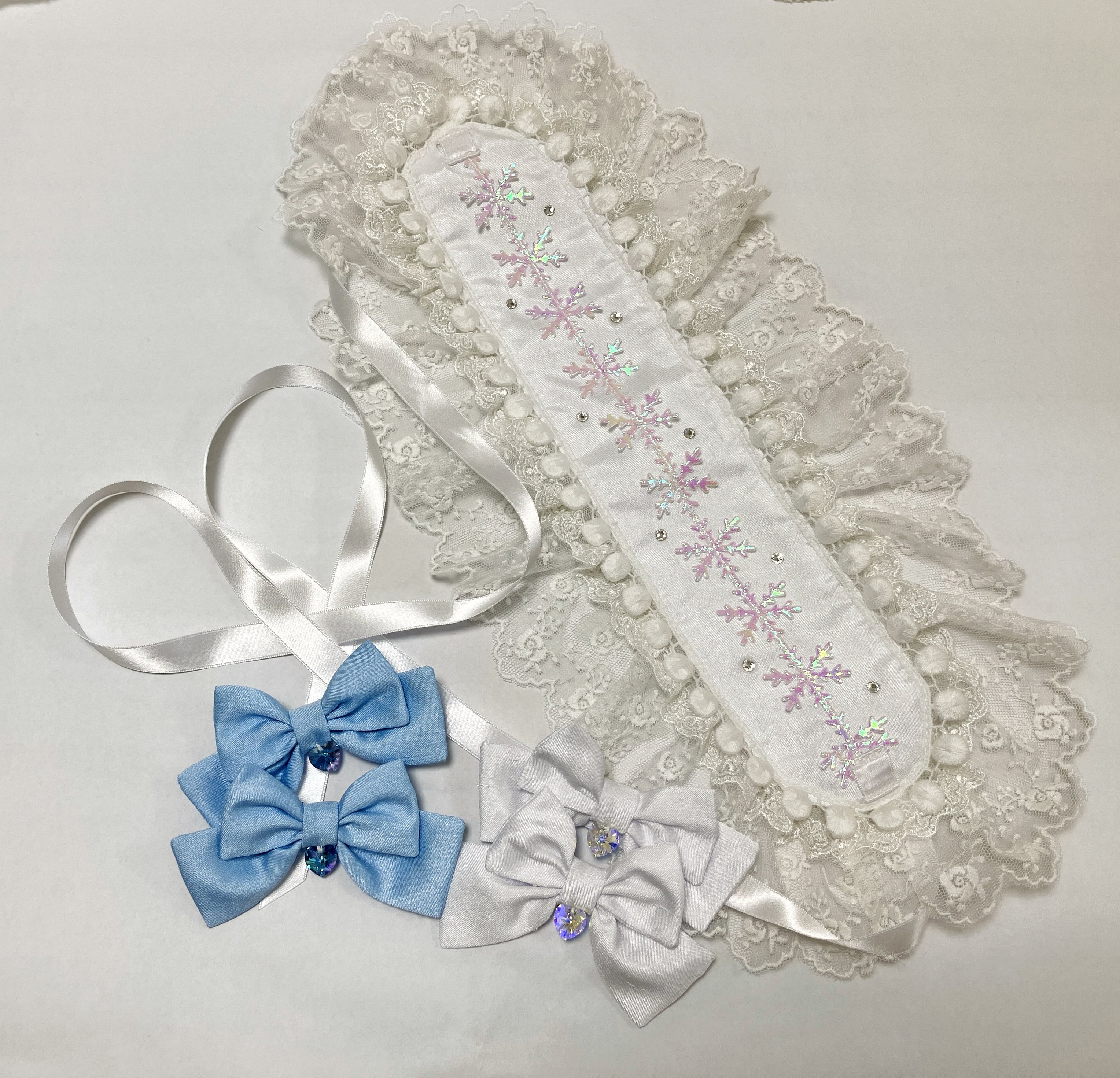 チュールレース、サテンリボン、ケミカルレース、ポリエステルシャンタン、クリスタルビーズ、ステンレス