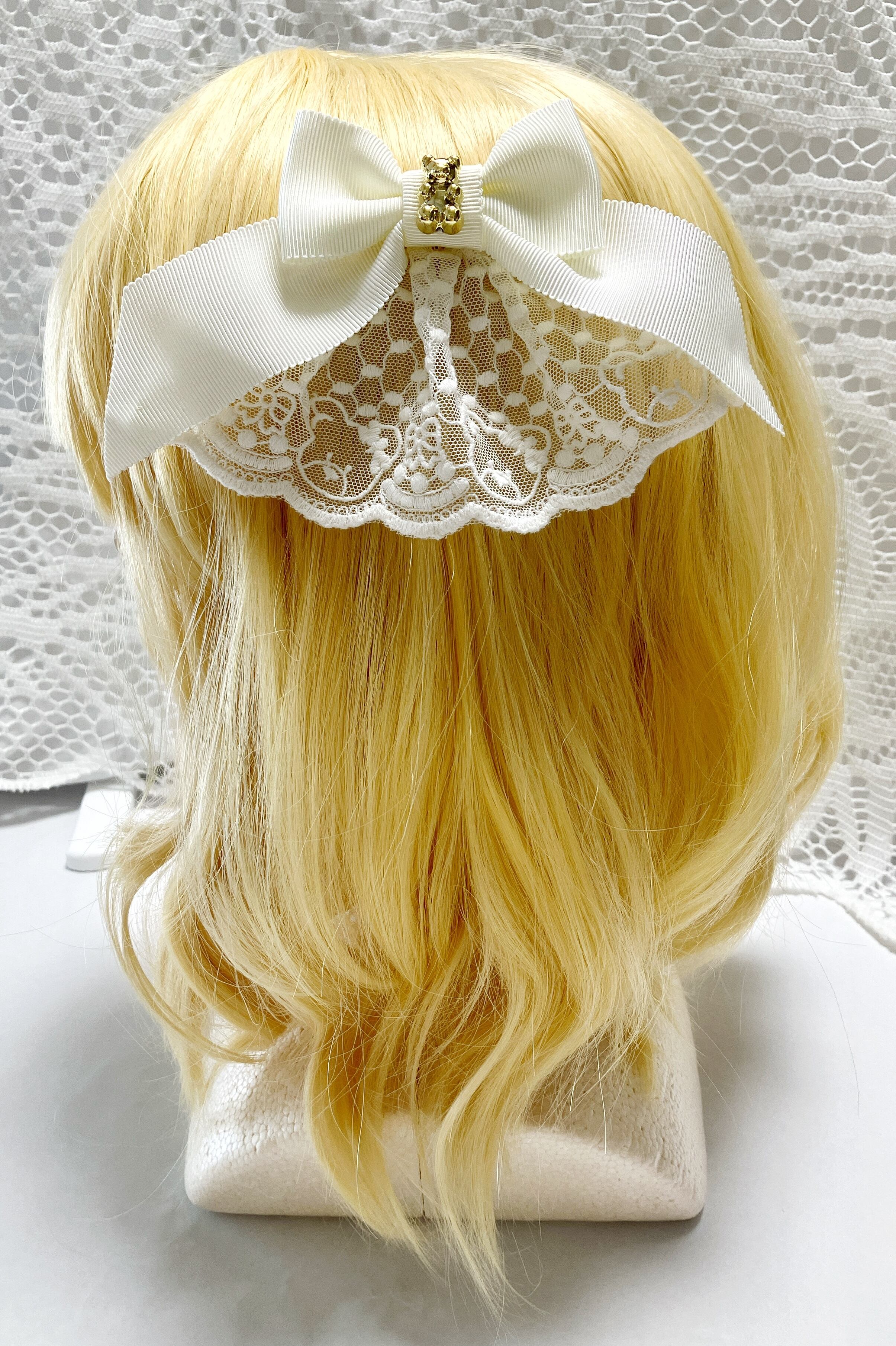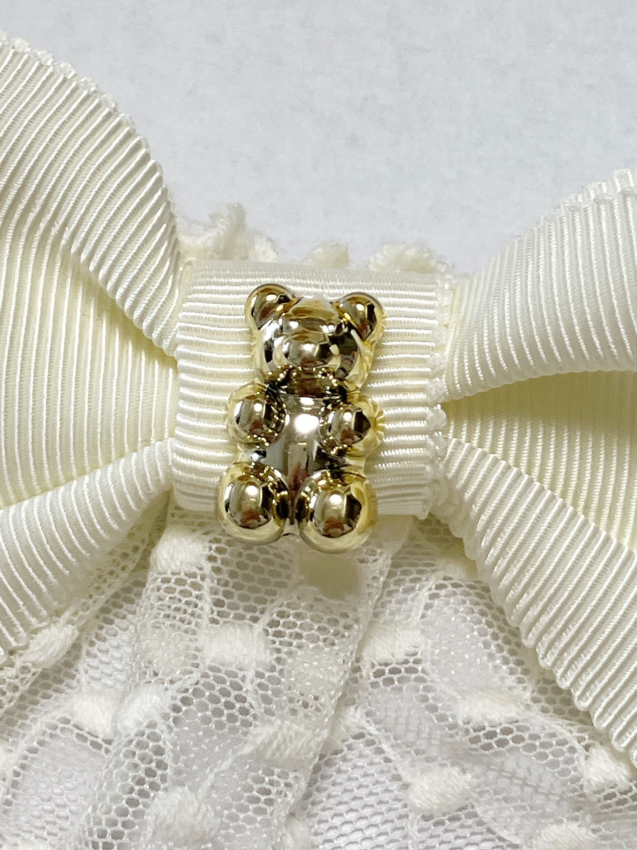 生成のグログランリボンにくまさん柄のレースとくまさんのチャームが付いたリボンクリップです。