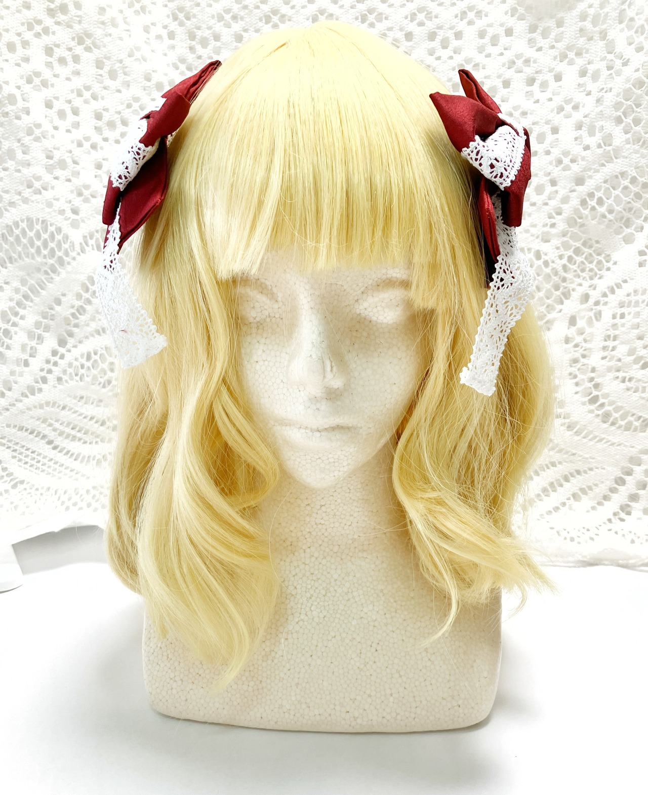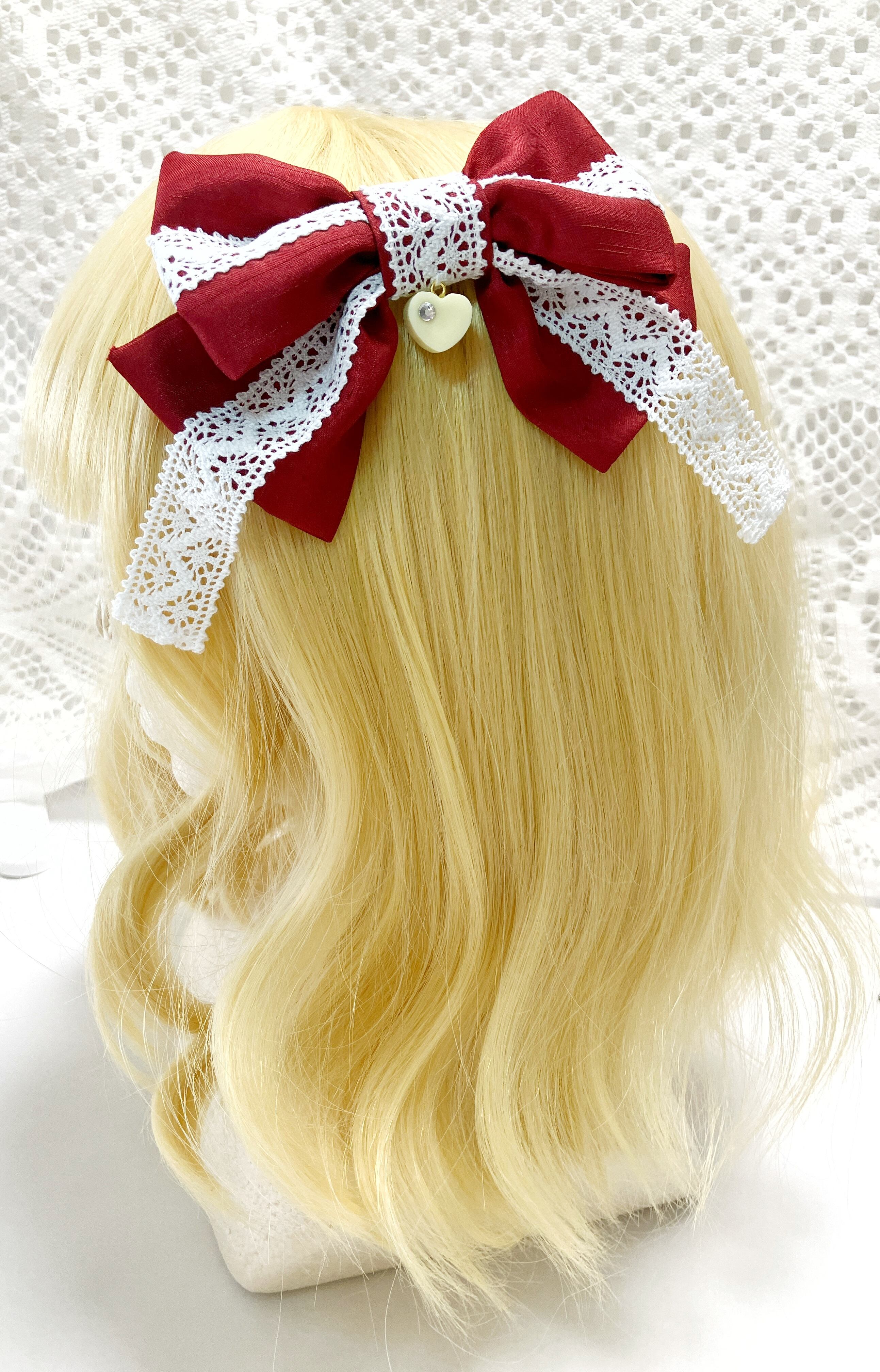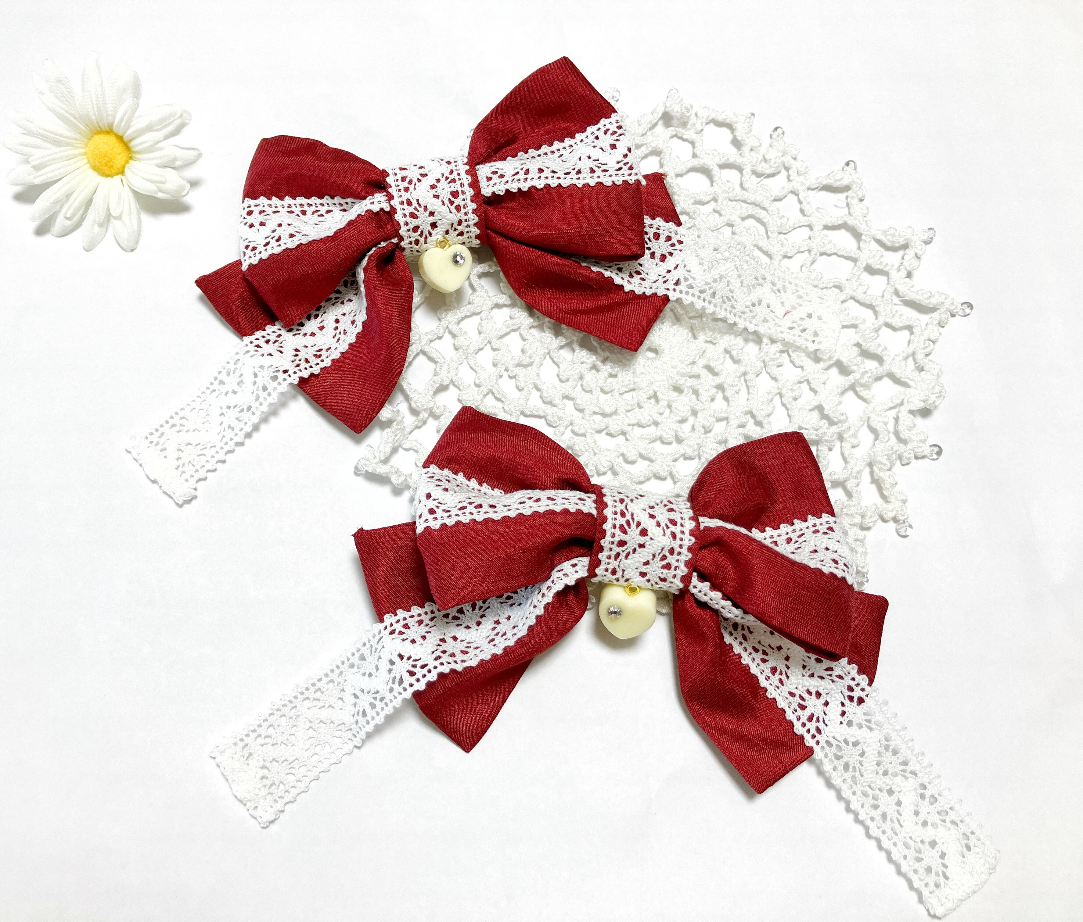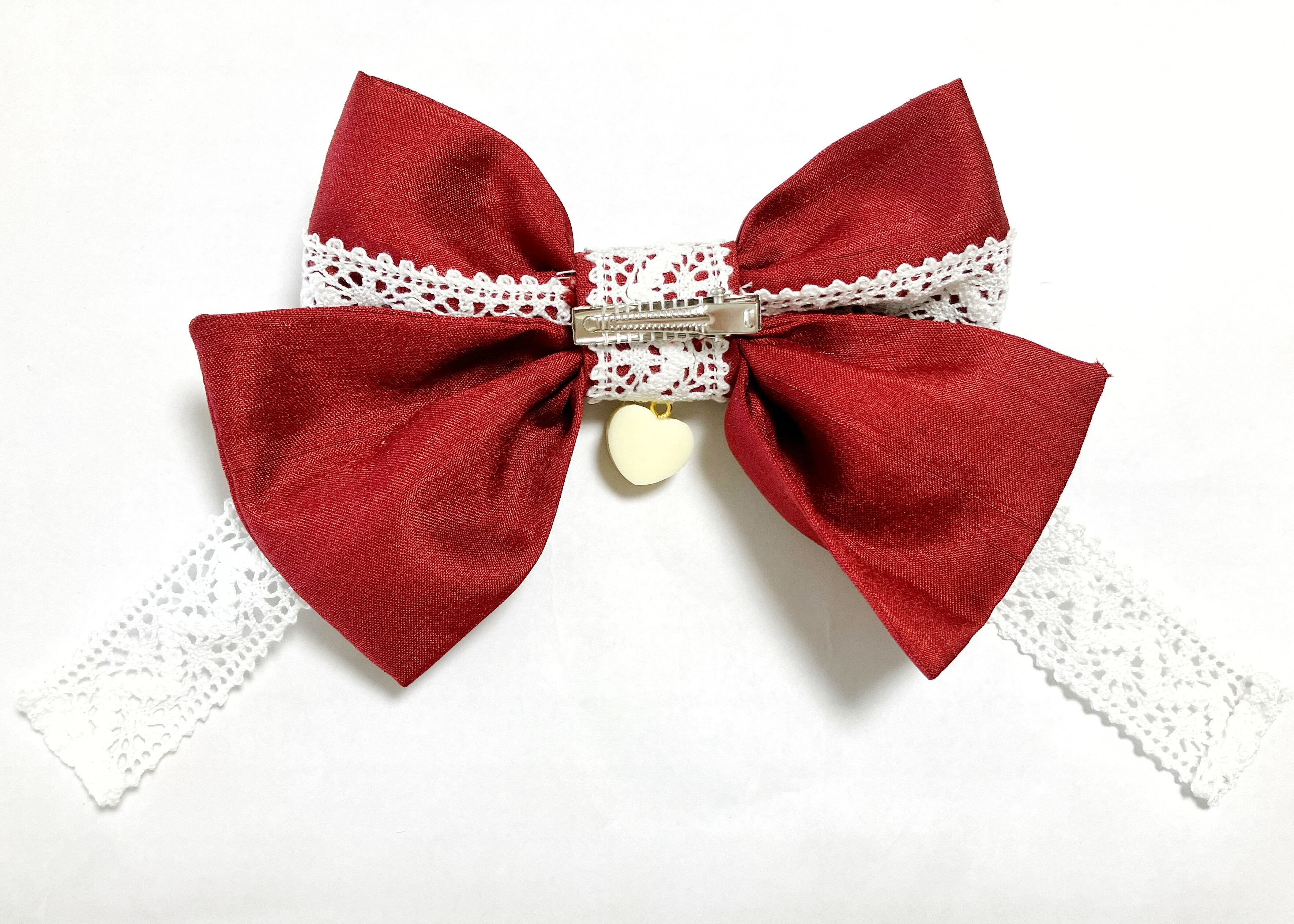 シャンタン地のリボンと幅太のトーションレースにキラキラのホワイトチョコレートがかわいいリボンクリップです